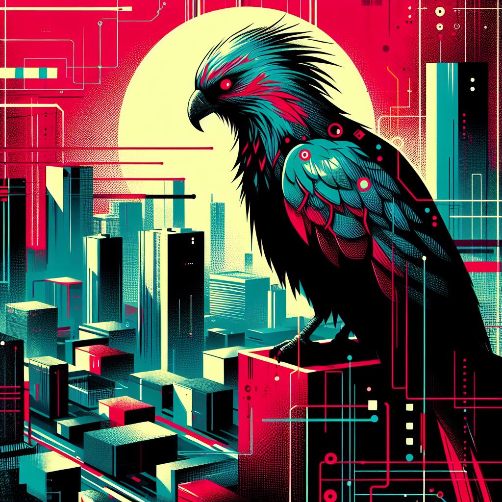 An image of a bird looking over a city, in the style of cyberpunk futurism, bright red background, light cyan, edgy street art, bold, colorful portraits, use of screen tones, dark proportions, modular