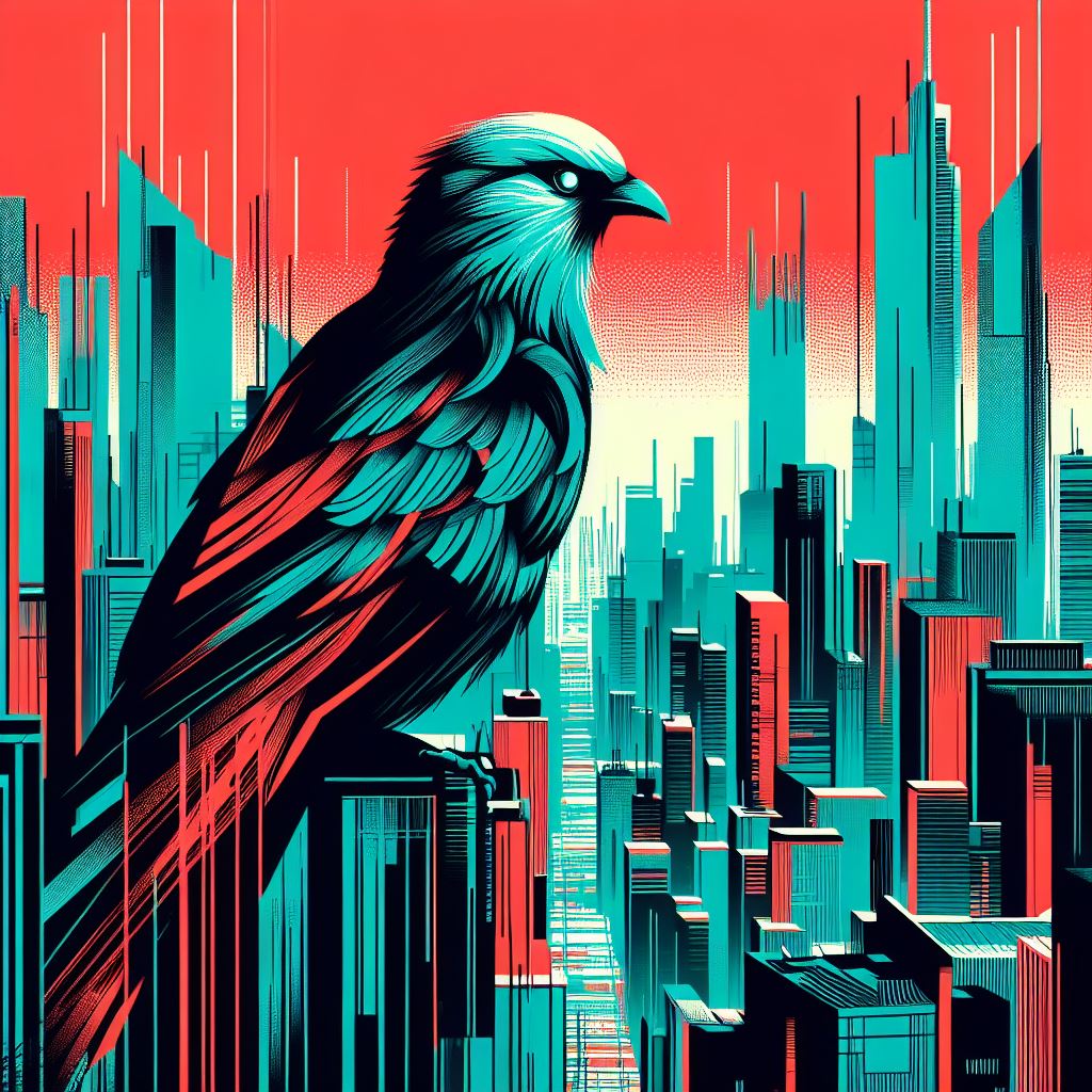 Image 3 of a bird looking over a city, in the style of cyberpunk futurism, bright red background, light cyan, edgy street art, bold, colorful portraits, use of screen tones, dark proportions, modular