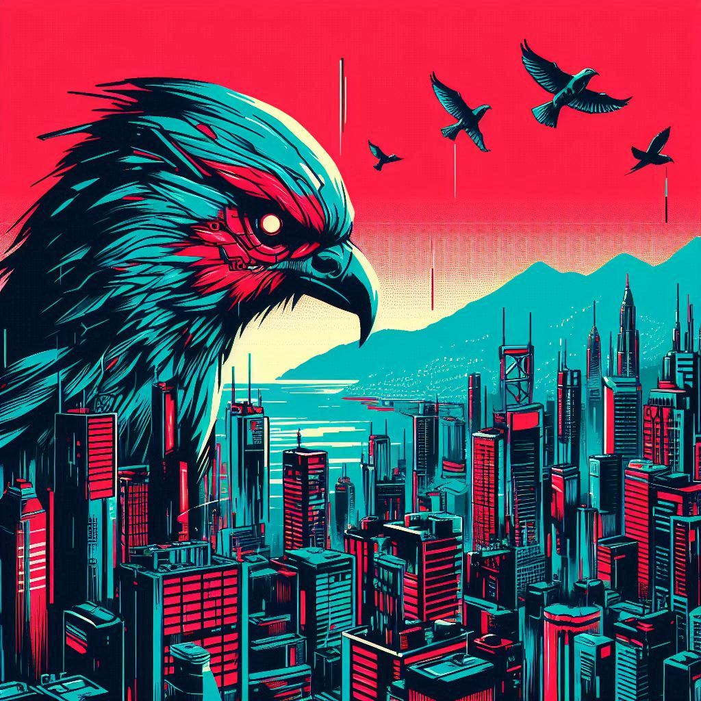 Image 5 of a bird looking over a city, in the style of cyberpunk futurism, bright red background, light cyan, edgy street art, bold, colorful portraits, use of screen tones, dark proportions, modular