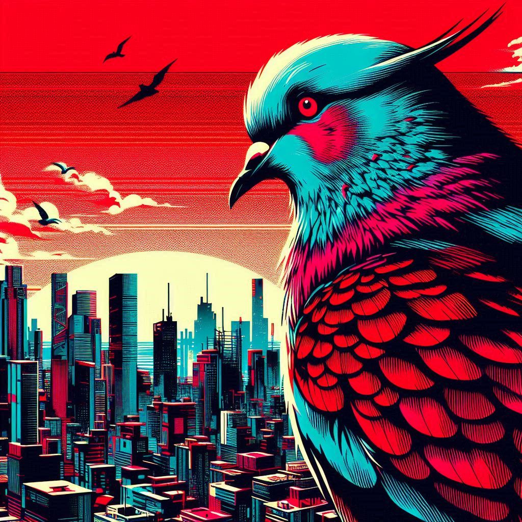 Image 6 of a bird looking over a city, in the style of cyberpunk futurism, bright red background, light cyan, edgy street art, bold, colorful portraits, use of screen tones, dark proportions, modular