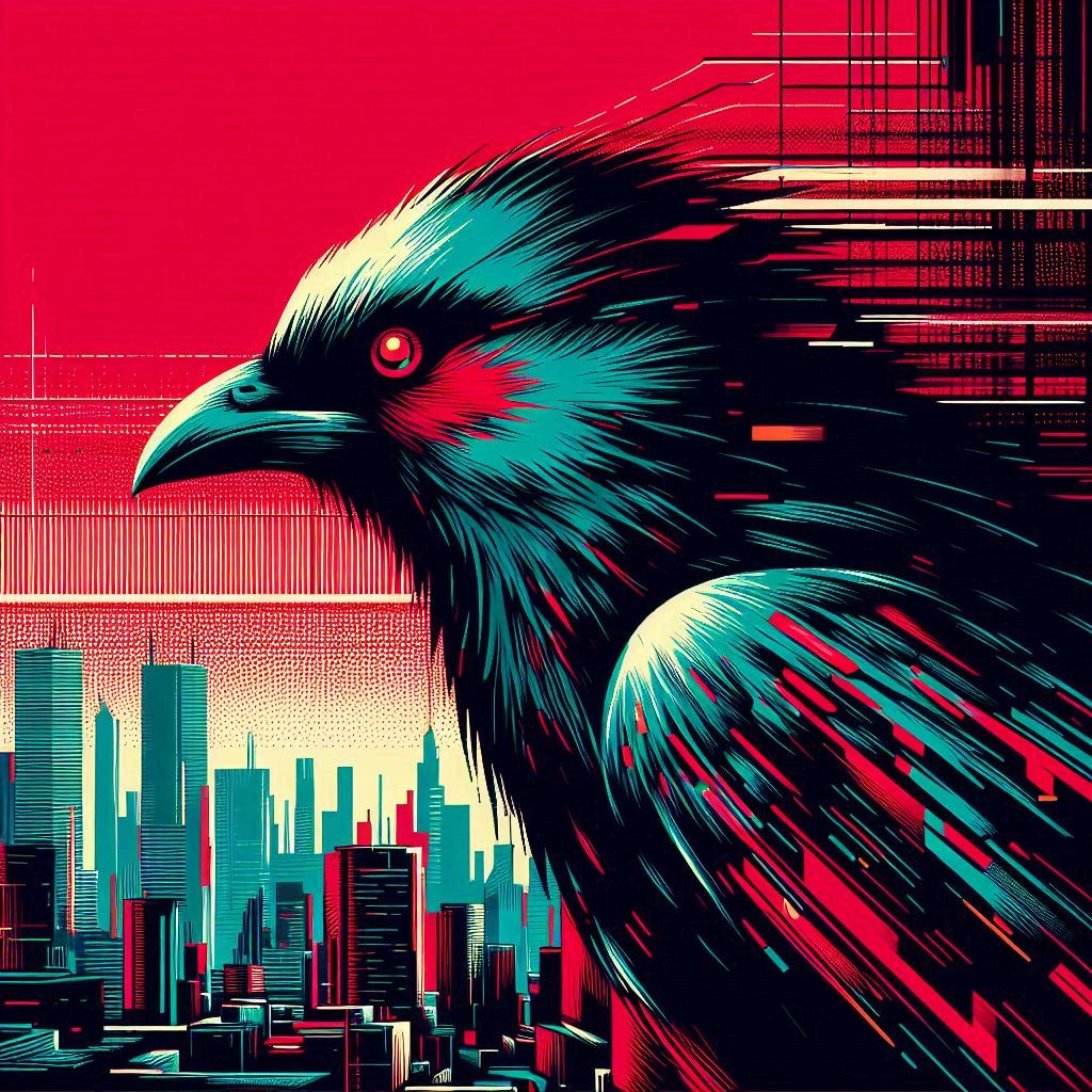 Image 8 of a bird looking over a city, in the style of cyberpunk futurism, bright red background, light cyan, edgy street art, bold, colorful portraits, use of screen tones, dark proportions, modular